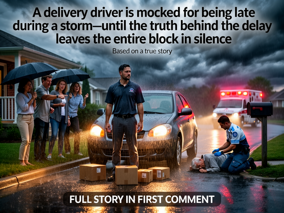 Drenched and shivering, the driver—Jason—stepped out, clutching a plastic-wrapped box like it was sacred. His brown uniform clung to him, shoes squelching with each step.