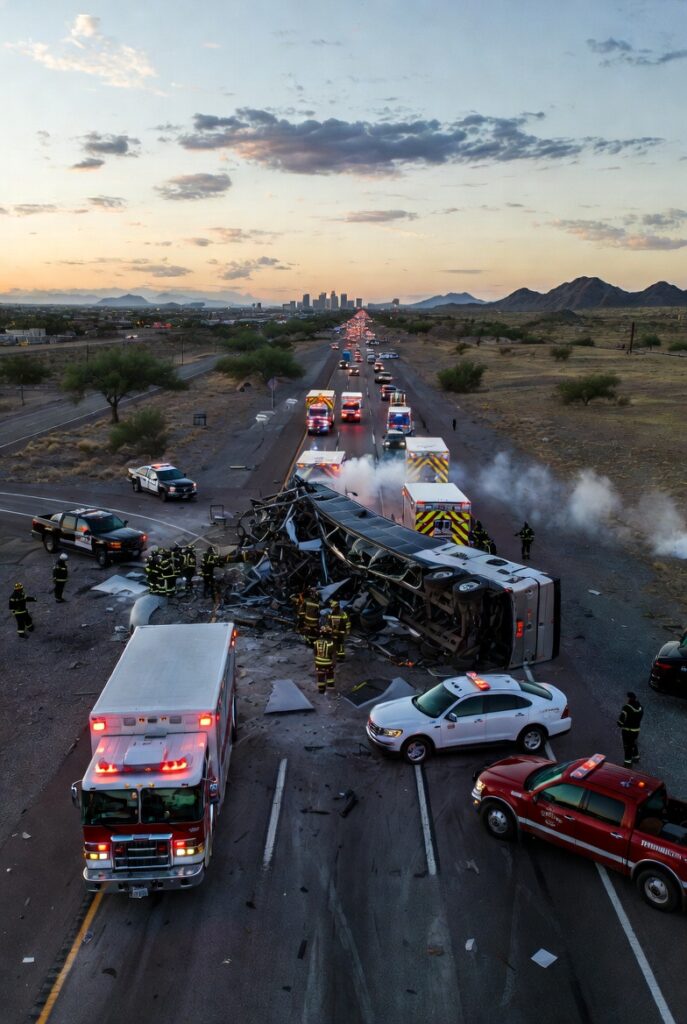It was supposed to be a normal morning commute and tourist route. Instead, it turned into one of the deadliest accidents in Arizona history. On February 26, 2026, a chartered tour bus carrying 27 passengers slammed into a massive crater-like pothole on Interstate 10 on the outskirts of Phoenix, causing the vehicle to flip multiple times and slide into oncoming traffic. The result: 19 people dead, 8 critically injured.