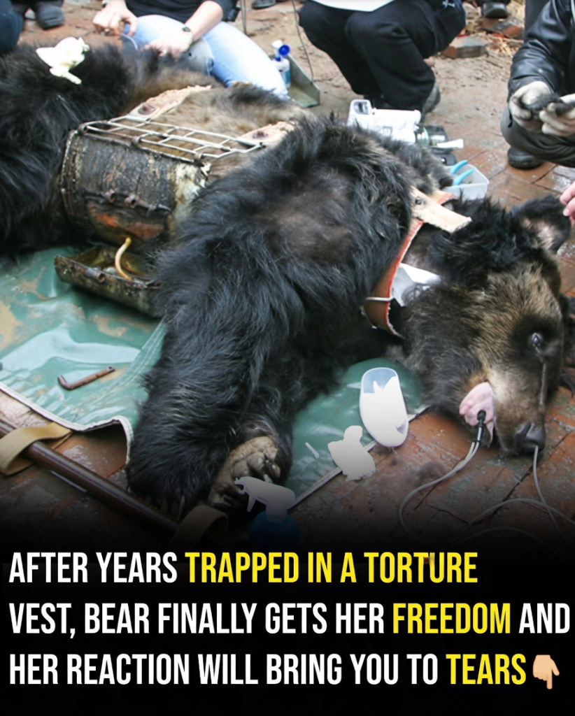 You sit at your kitchen table on an ordinary afternoon, watching a rescue video that is almost too painful to watch at first. A massive bear had been trapped for days — possibly weeks — in a cruel metal snare designed to hold animals for illegal hunting or bile farming. The device had cut deep into his flesh, causing immense suffering and infection. His eyes showed exhaustion and despair as rescuers carefully approached.