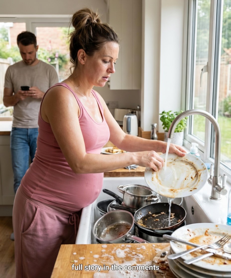 You walked back into the kitchen and froze. There was your eight-month-pregnant wife, Lucía, standing alone at the sink at 10 o’clock at night. Her swollen belly pressed against the counter as she slowly washed a mountain of dishes. The only sound was running water while the rest of the family sat comfortably in the living room.