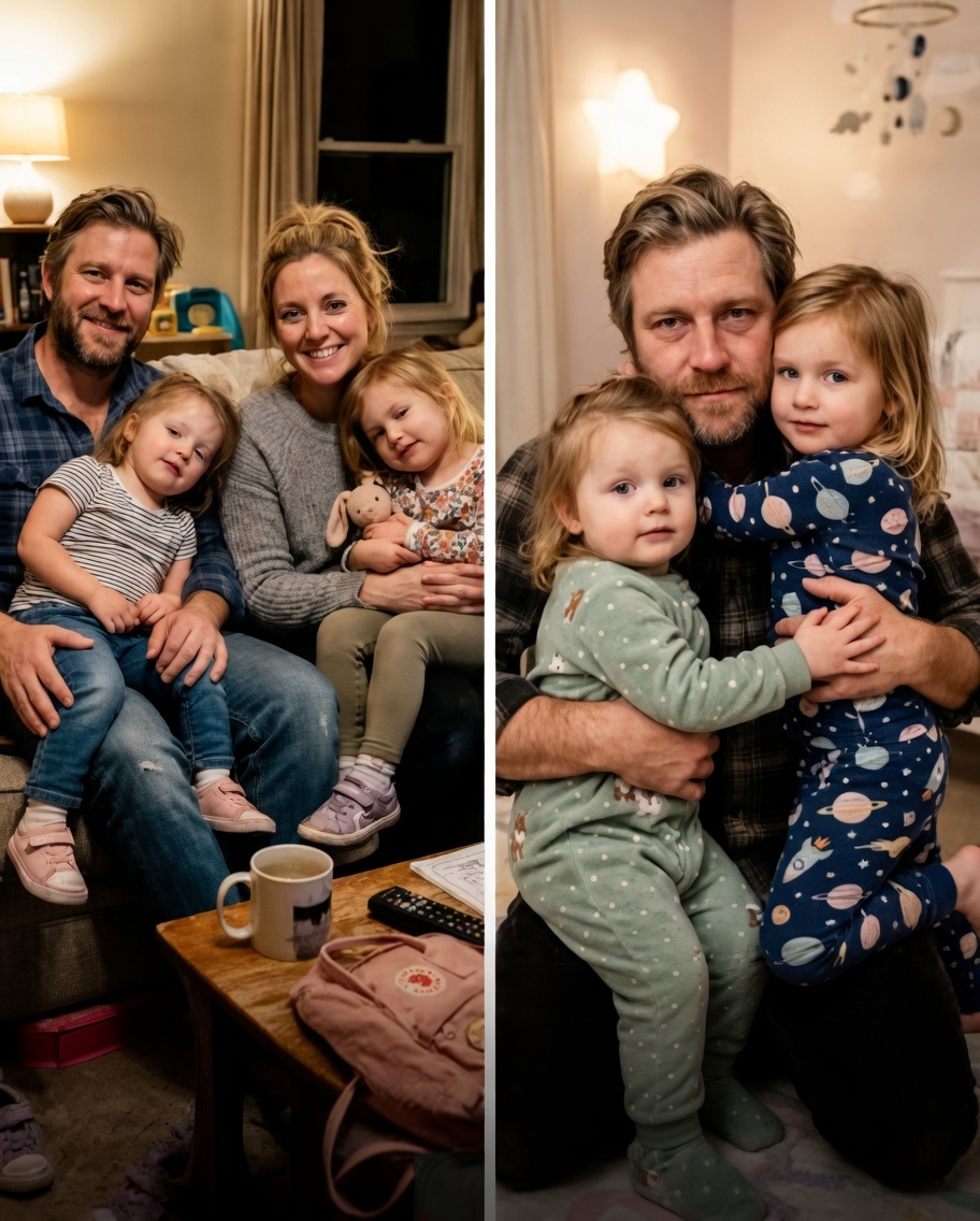 Walking into a silent house after a long day should feel like coming home, but that Tuesday evening at 6:17 p. m. the quiet felt wrong from the first step inside. No television hummed in the background, no small feet pattered down the hallway to greet me, and the familiar smell of Jyll’s cooking was completely absent. My twin daughters, Emma and Lily, both five, sat side by side on the living room couch with their knees drawn up tight to their chests. They were still dressed in their daycare uniforms, shoes still laced, backpacks zipped and waiting by the front door exactly as the daycare driver must have left them. Their little faces looked pale and uncertain, and when I asked where Mommy was, they exchanged that silent twin glance before Emma whispered that Mommy had taken her suitcase. Lily added in the same small voice that Mommy had said goodbye forever. The words landed like ice water in my veins.