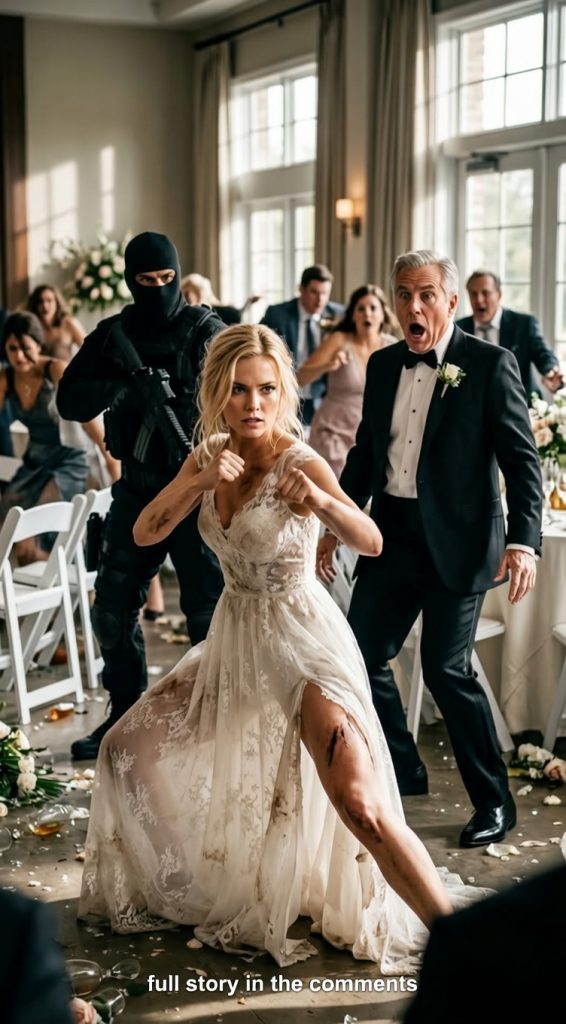 You stood in your wedding dress, the music playing softly, when the cartel gunmen stormed the reception hall. Bullets flew as they shouted orders to execute the entire Harrison family. Your billionaire in-laws froze in terror, realizing their wealth couldn’t save them now.