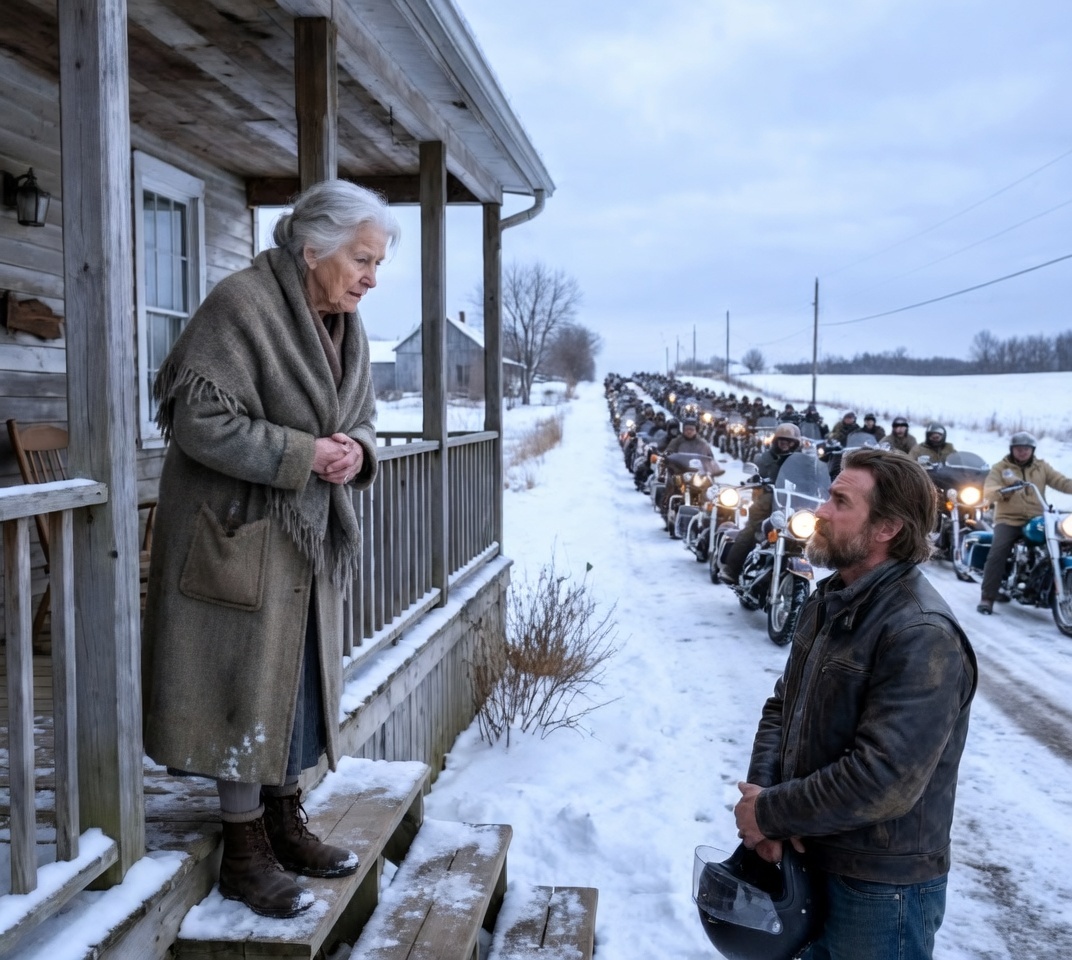Now the silence after the blizzard felt wrong—too complete, too watchful. Agnes had lived alone on this stretch of Montana backcountry since her husband died twelve winters ago. She knew every sound the valley made: the groan of the barn roof settling, the coyotes yipping on the ridge, the low rumble of logging trucks miles away. This was different. First came the vibration in the floorboards, then the distant growl that grew into a chorus of engines. Headlights appeared one after another, slicing through the dark like searchlights, until a hundred beams converged on her small house. Trucks, motorcycles, ATVs—too many to count—lined the road and spilled into her yard. She reached for the shotgun above the doorframe, but her hand froze. The man who stepped forward from the lead truck raised both palms in the universal sign of peace.