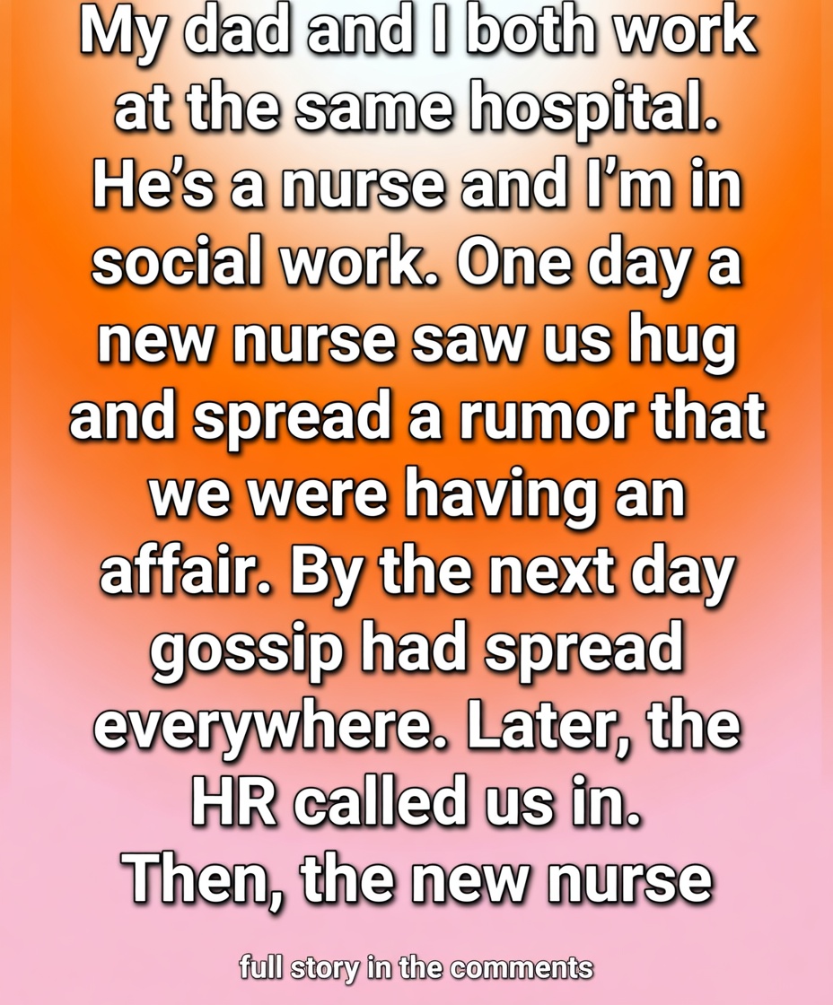 By the time you arrived for your next shift, whispers were already flying. Someone had seen the hug and decided it looked “too intimate.” Within hours the rumor turned into a full-blown scandal: an alleged affair between a veteran nurse and a much younger colleague. No one bothered to mention that the colleague was his daughter. The gossip spread through the hospital faster than any official memo ever could.