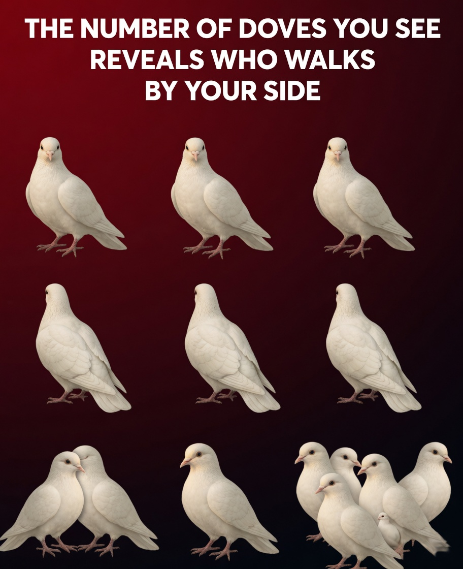 The image appears innocent at first glance — a flock of white doves soaring across a soft blue sky — yet when you look closer, something shifts. Some people see only the birds. Others notice a faint, protective silhouette walking alongside them, almost invisible unless you know exactly where to look. That silhouette is your hidden guardian, and the way you perceive the doves reveals the truth about the unseen presence that has been guiding and protecting you all along.