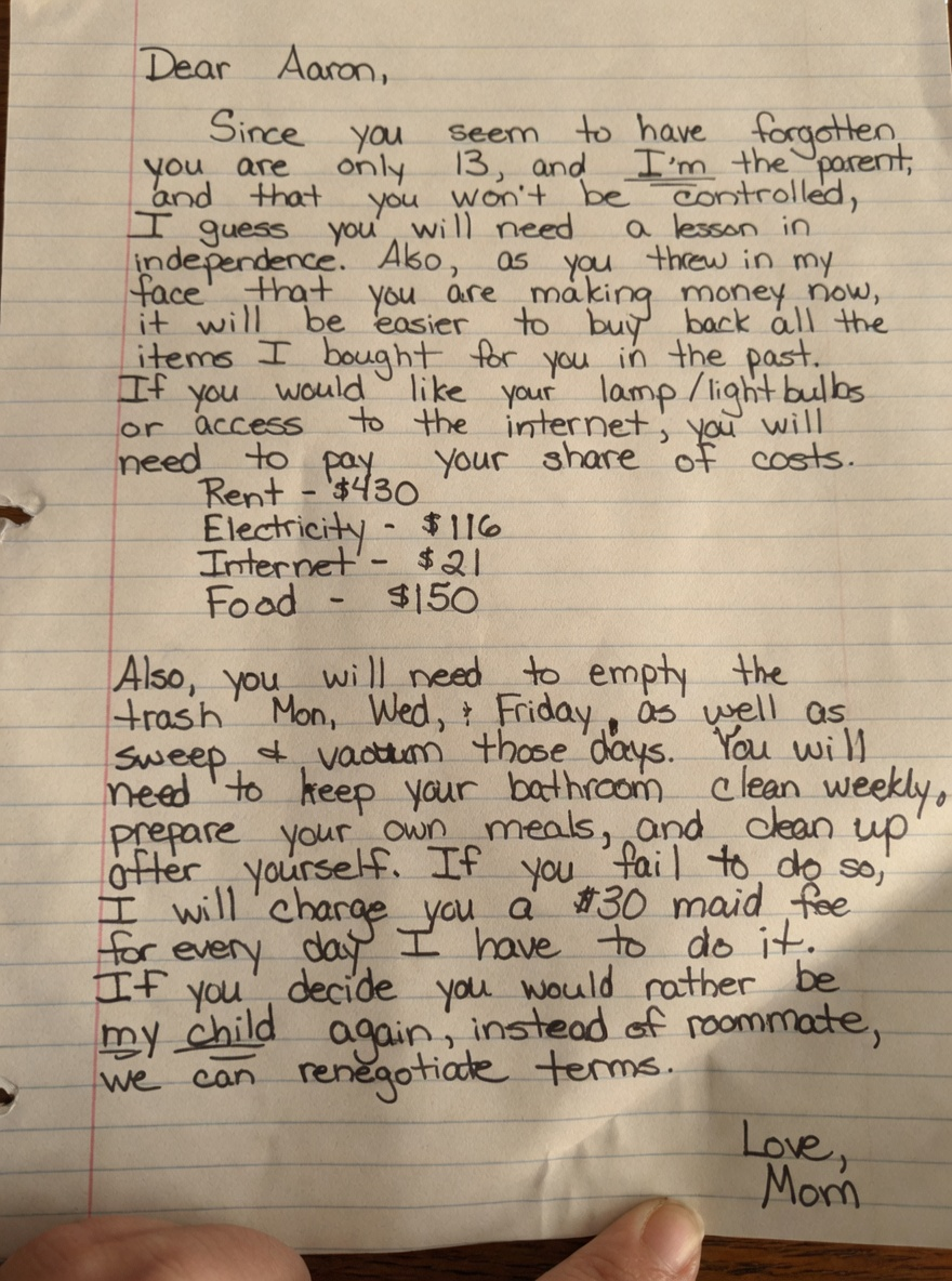 The mother had reached her breaking point after months of eye-rolling, mess, demands, and zero contribution from her teenage son who treated the family home like a free hotel with unlimited service. Instead of another lecture, she sat down at the kitchen table and created a detailed monthly invoice charging him for rent, groceries, utilities, laundry, internet, and even a small “management fee” for the emotional labor of running the household.
