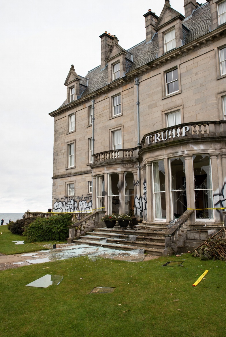 Turnberry isn’t just any mansion. It’s a historic 800-acre golf resort and luxury hotel on Scotland’s rugged Ayrshire coast, purchased by Trump in 2014 and turned into a world-class destination that employs hundreds of locals and pumps tens of millions into the Scottish economy every year. The main mansion house — the opulent centerpiece with its grand stone facade, sweeping views of the Atlantic, and rooms that have welcomed presidents and billionaires — was hit hardest. Vandals struck under cover of darkness, spray-painting slogans across the historic walls, shattering 27 windows, and destroying priceless landscaping and security cameras worth hundreds of thousands alone.