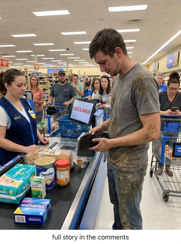 The cashier ran the card again while the young father stood there in his mud-caked work boots, staring at the floor. Two cans of formula, a box of diapers, bread, peanut butter, cough medicine, and a pack of sanitary pads sat on the belt. The total wasn’t large, but the machine beeped “declined” for the third time. He swallowed hard and began quietly removing items. First the peanut butter. Then the bread. The line behind him started to sigh and check their watches. Nobody knew his wife was home bleeding heavily six days after giving birth.